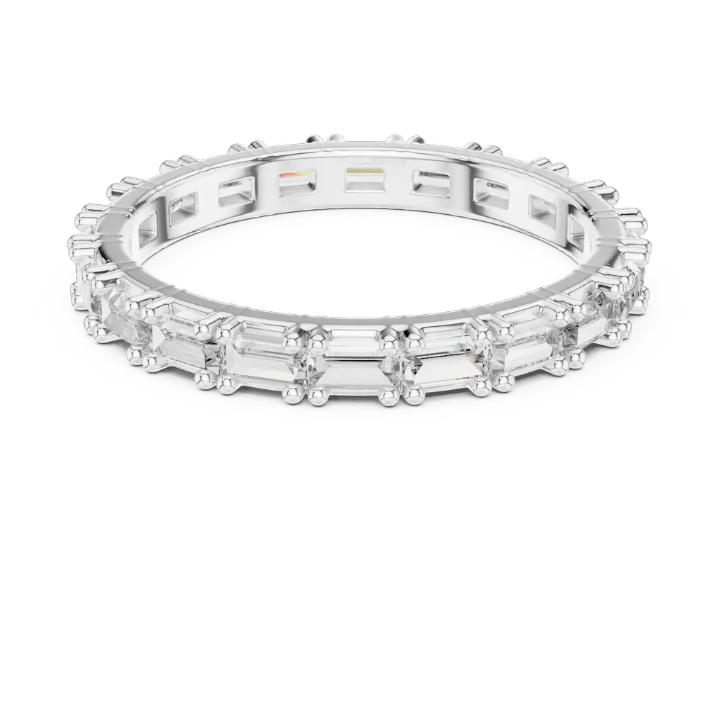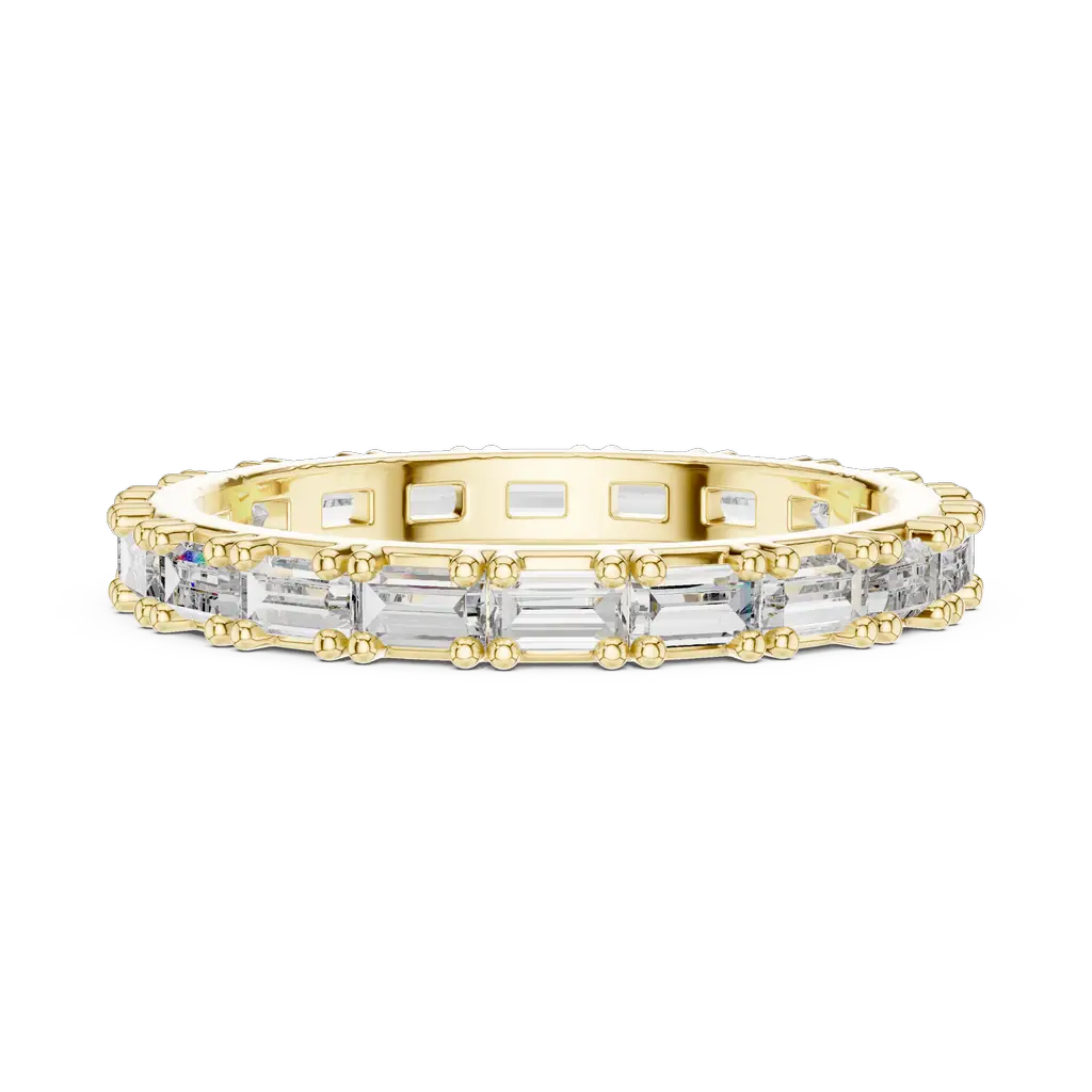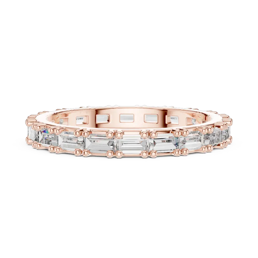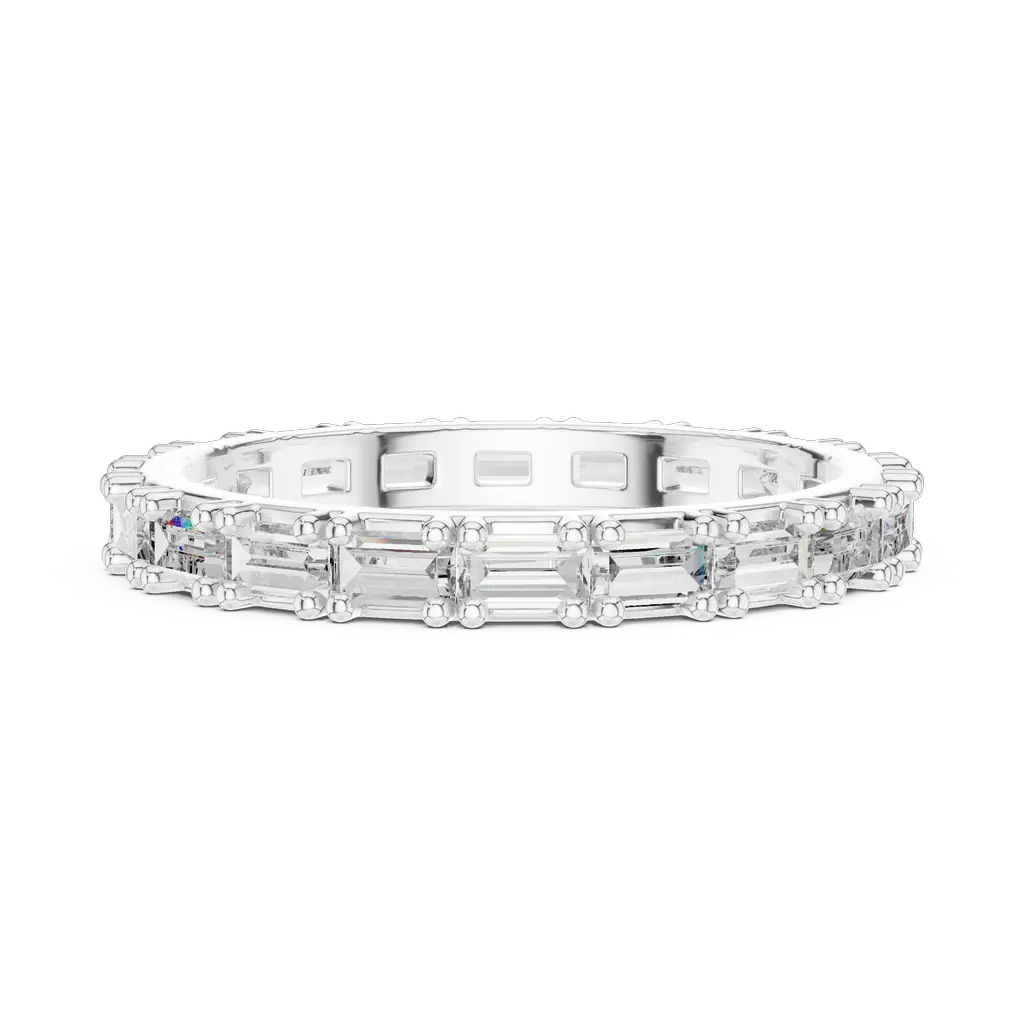 This elegant ladies ring features 20 baguette-cut diamonds set in a sleek collet setting, offering a modern yet timeless appeal. Designed in a classic band style, it is available in Gold, Silver, and Rose Gold finishes. Ideal for both daily wear and special occasions, the clean lines and precise diamond placement enhance its refined charm. Crafted with precision, this piece balances brilliance and sophistication effortlessly.