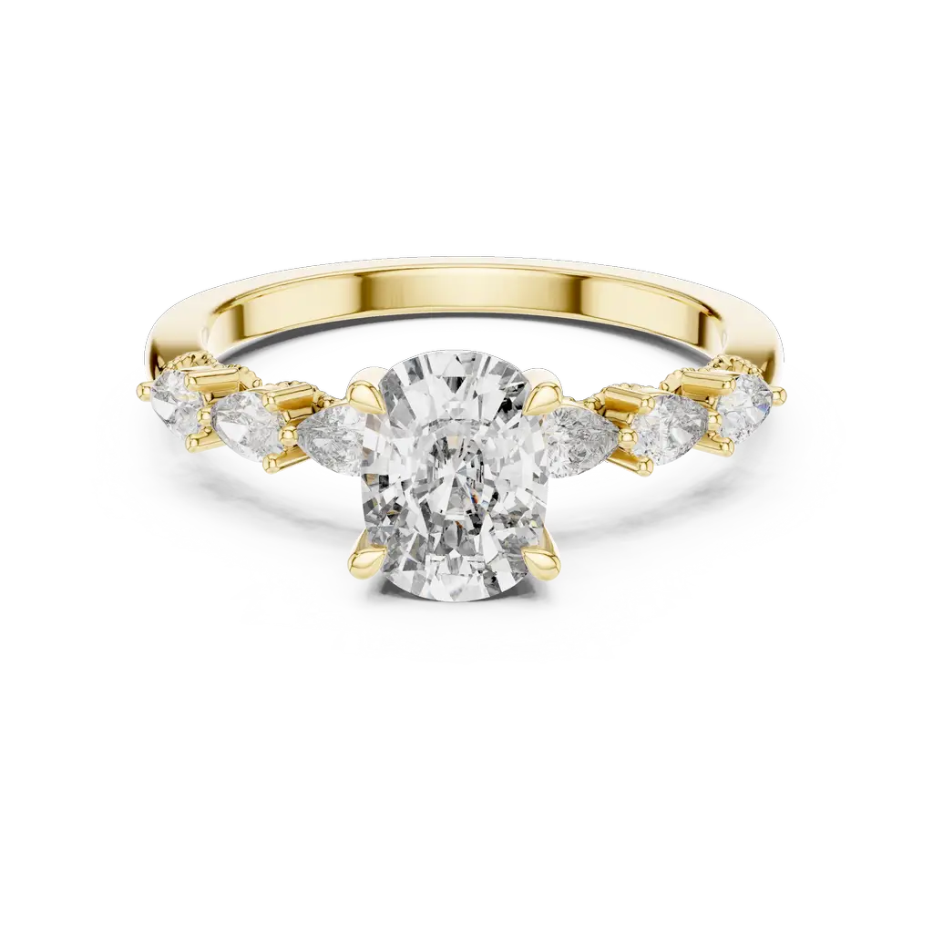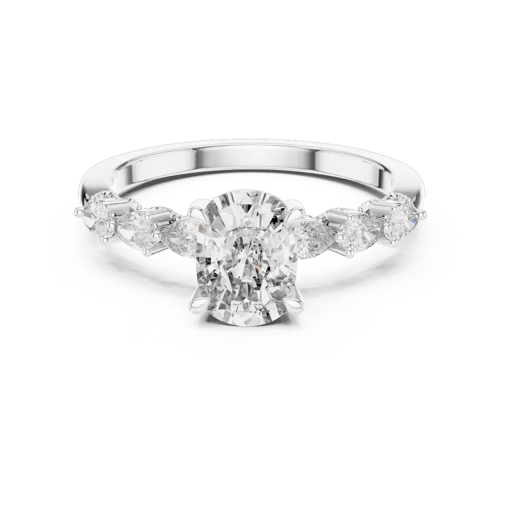 This elegant ladies ring features a unique combination of cushion, pear, and round cut diamonds arranged to enhance brilliance and design. The centerpiece cushion cut is complemented by pear-shaped and small round diamonds in prong and collet settings. A stunning piece ideal for any special moment. Available in three elegant finishes—Gold, Silver, and Rose Gold—to suit your personal style.