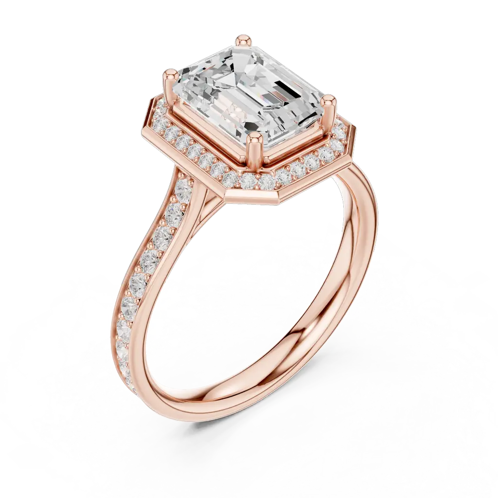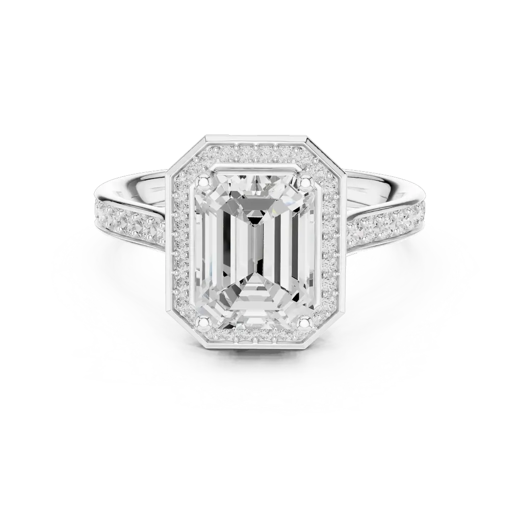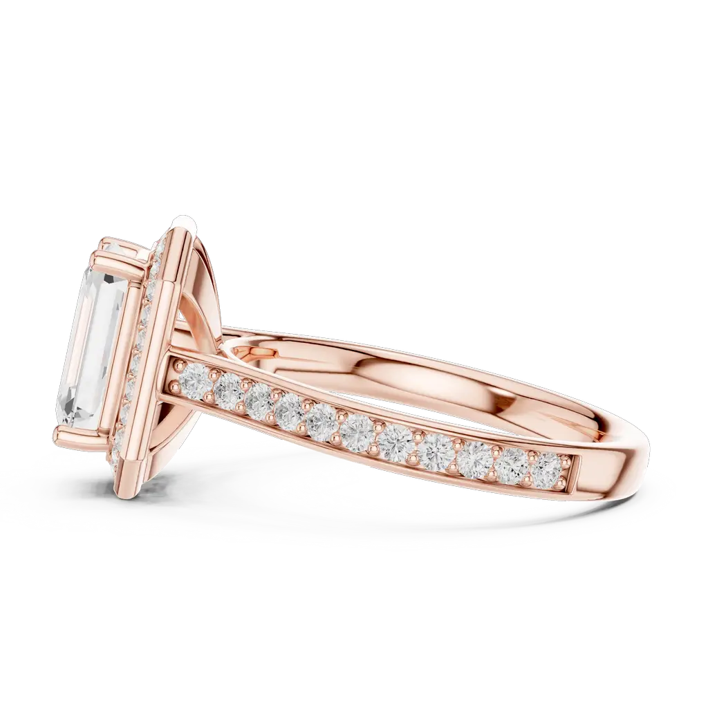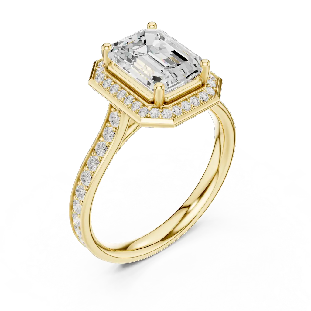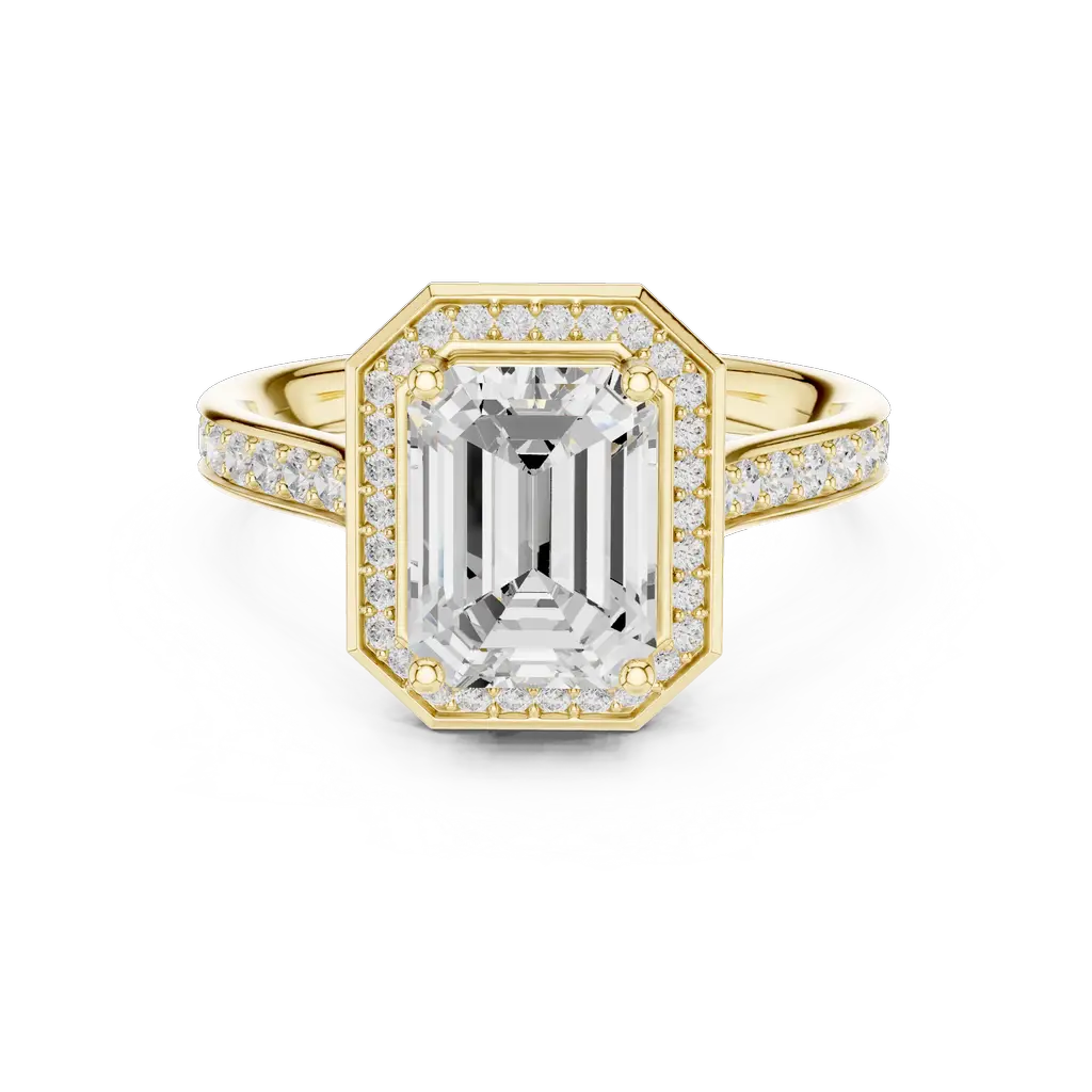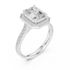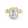 Emerald-cut center diamond ring with round pave-set accents. Available in Gold, Silver, and Rose Gold. Classic beauty with a modern edge for every style.