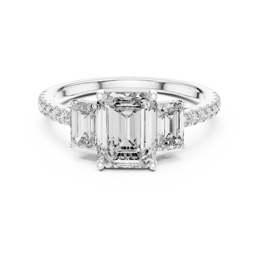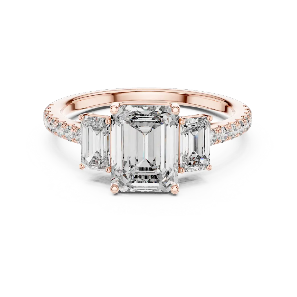 Stunning ring with emerald-cut stones and round diamonds in elegant settings. A perfect blend of sparkle and style, available in Gold, Silver, and Rose Gold.