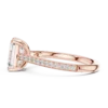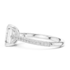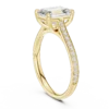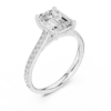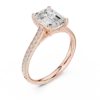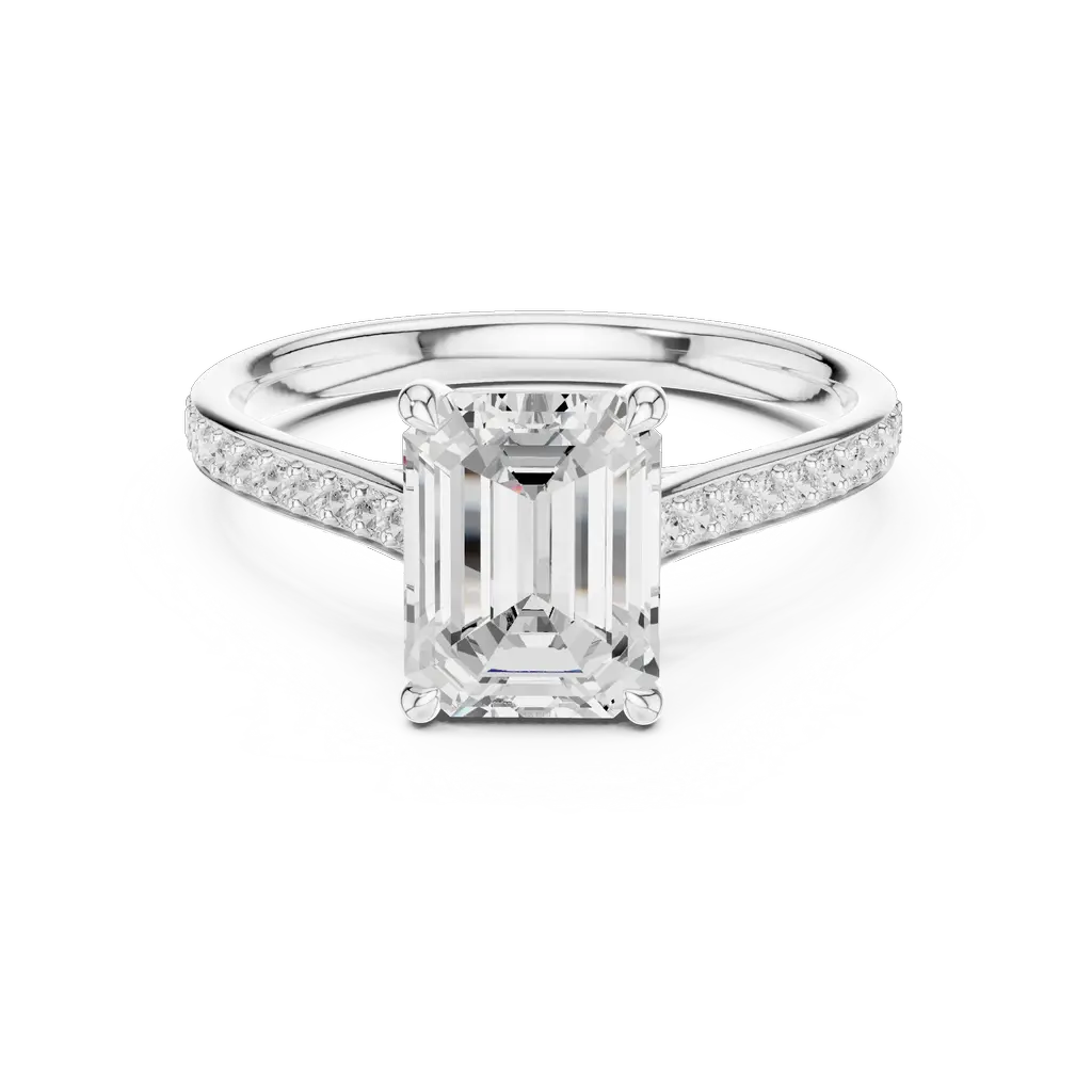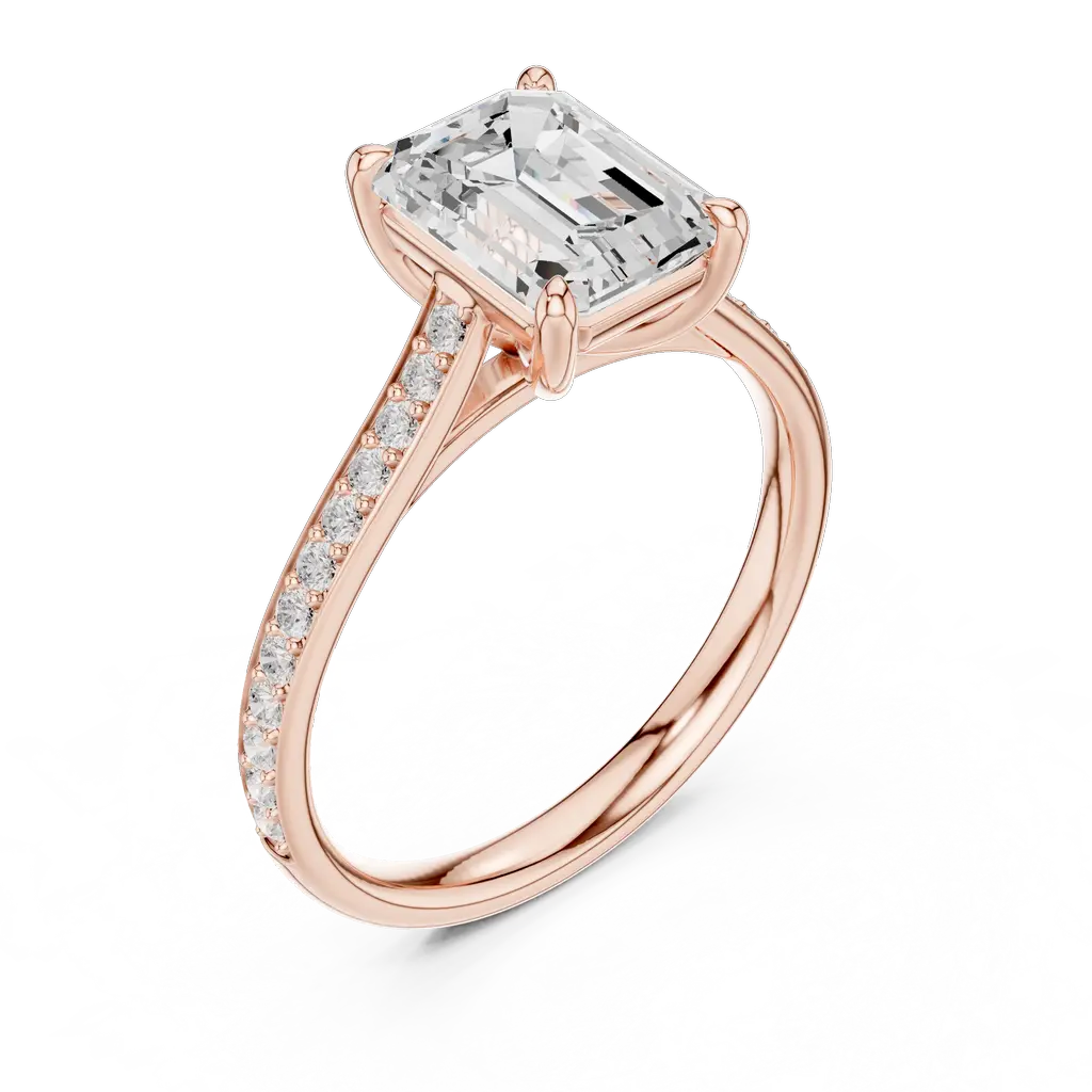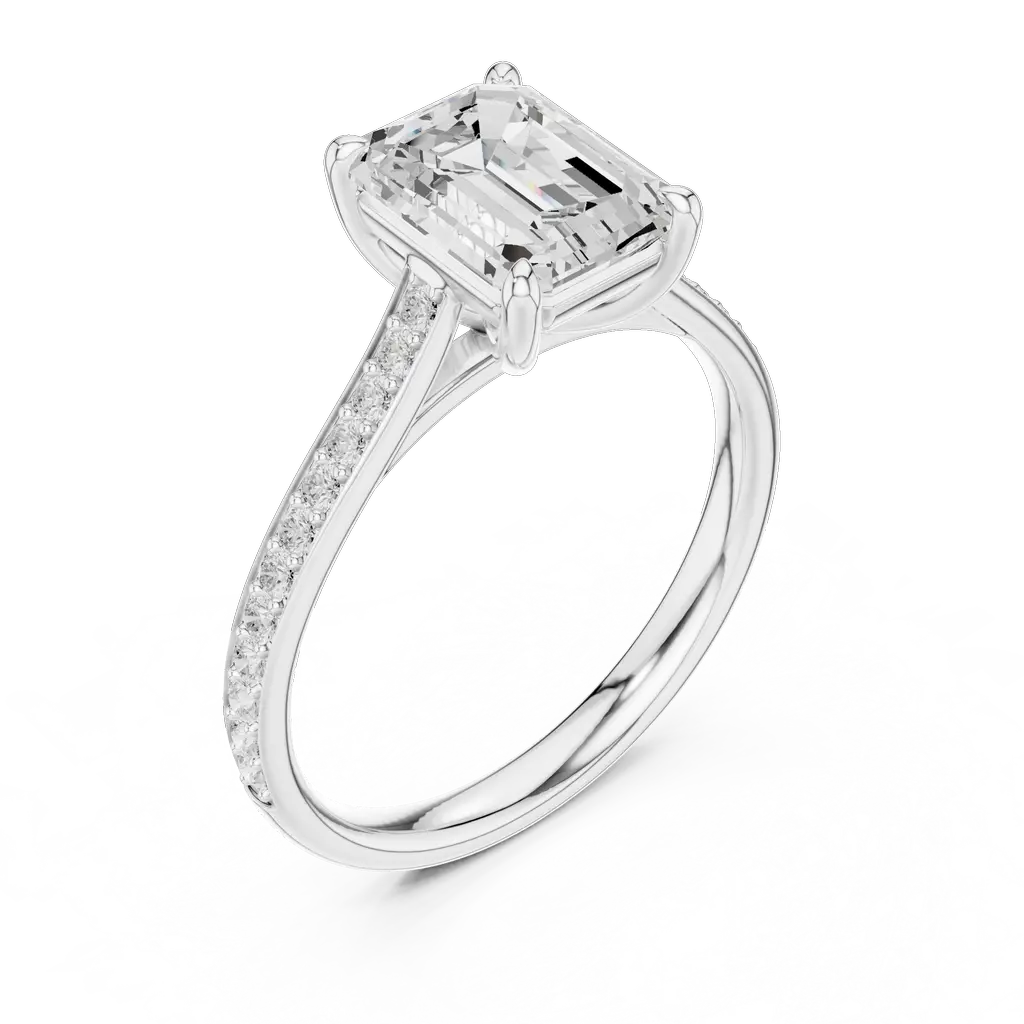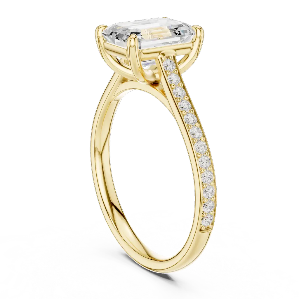Emerald-cut solitaire ring with pave diamond band. Elegant and timeless design available in Gold, Silver, and Rose Gold. A statement of graceful sophistication.