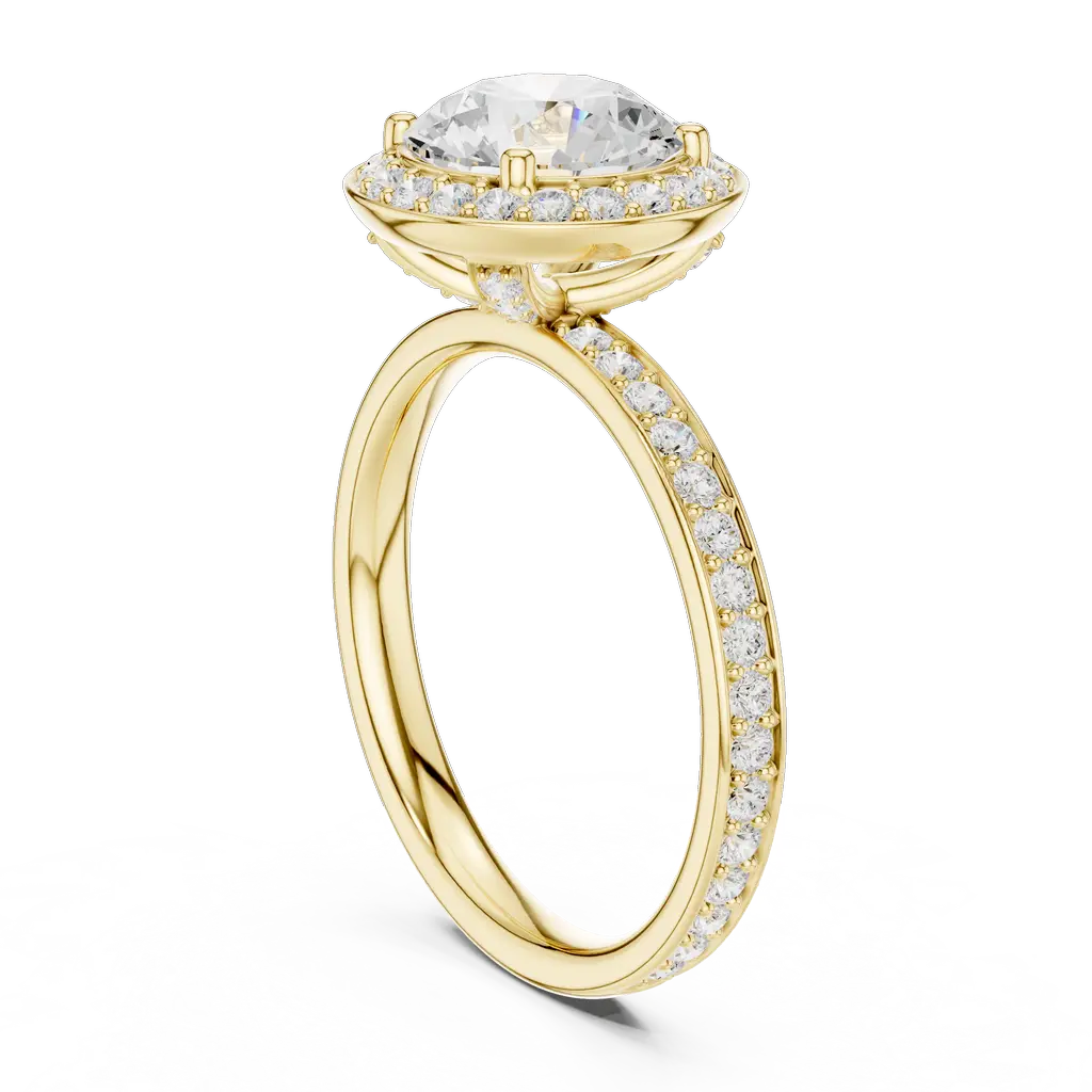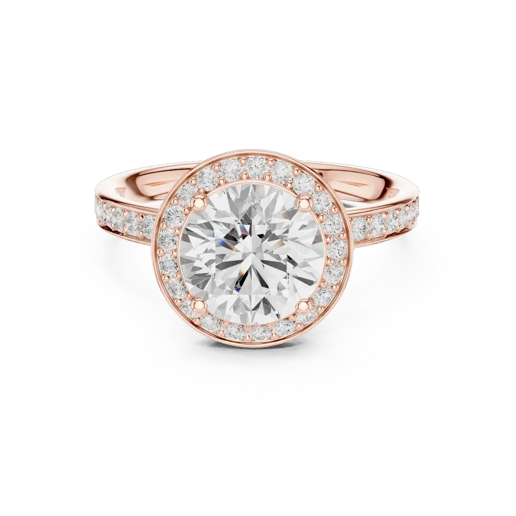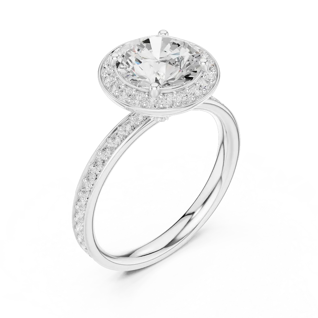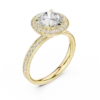Halo ring with brilliant round diamonds and pave band, featuring 66 stones. Available in Gold, Silver, and Rose Gold for a timeless and radiant finish.