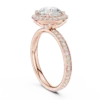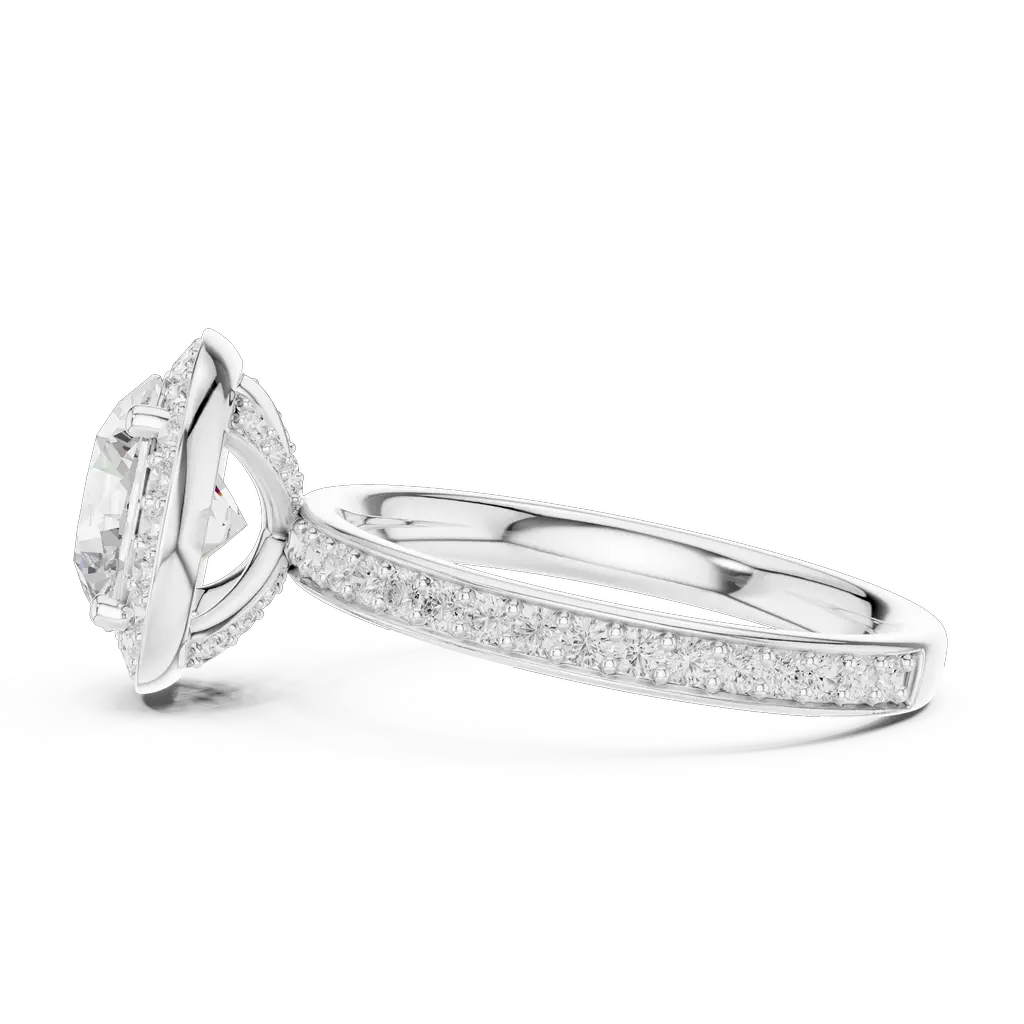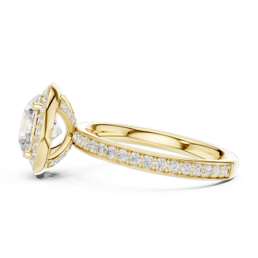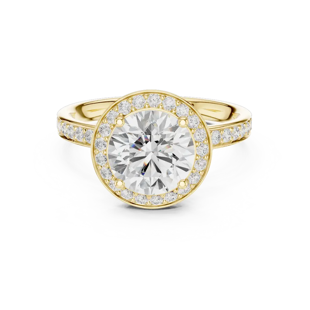 Halo ring with brilliant round diamonds and pave band, featuring 66 stones. Available in Gold, Silver, and Rose Gold for a timeless and radiant finish.