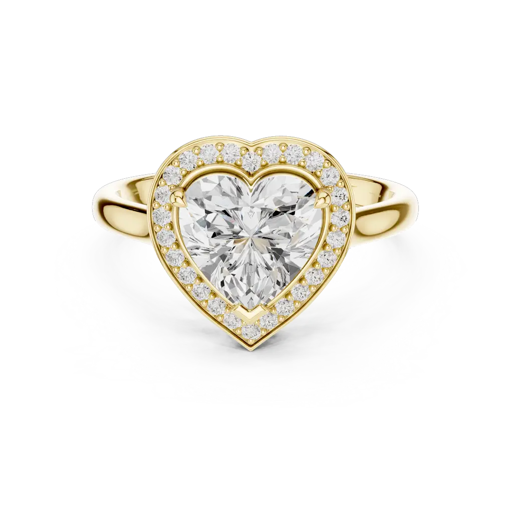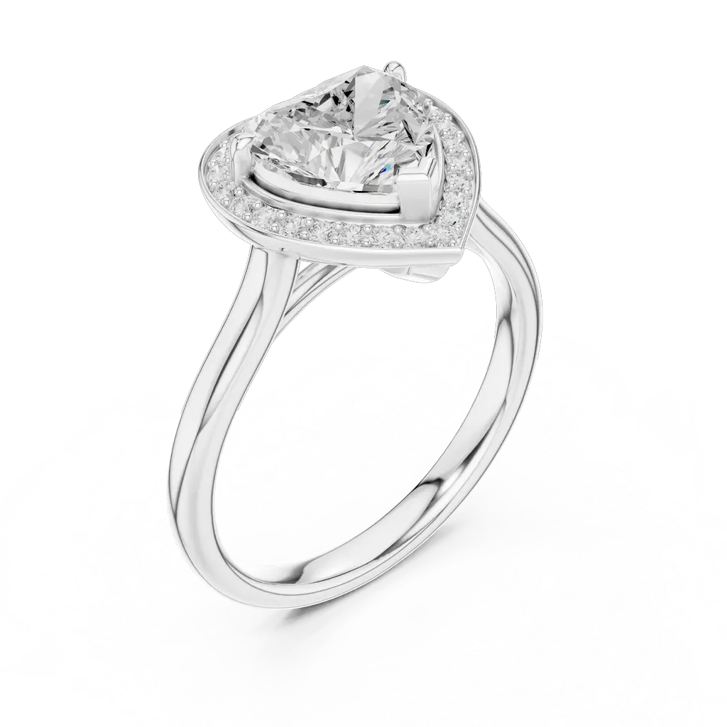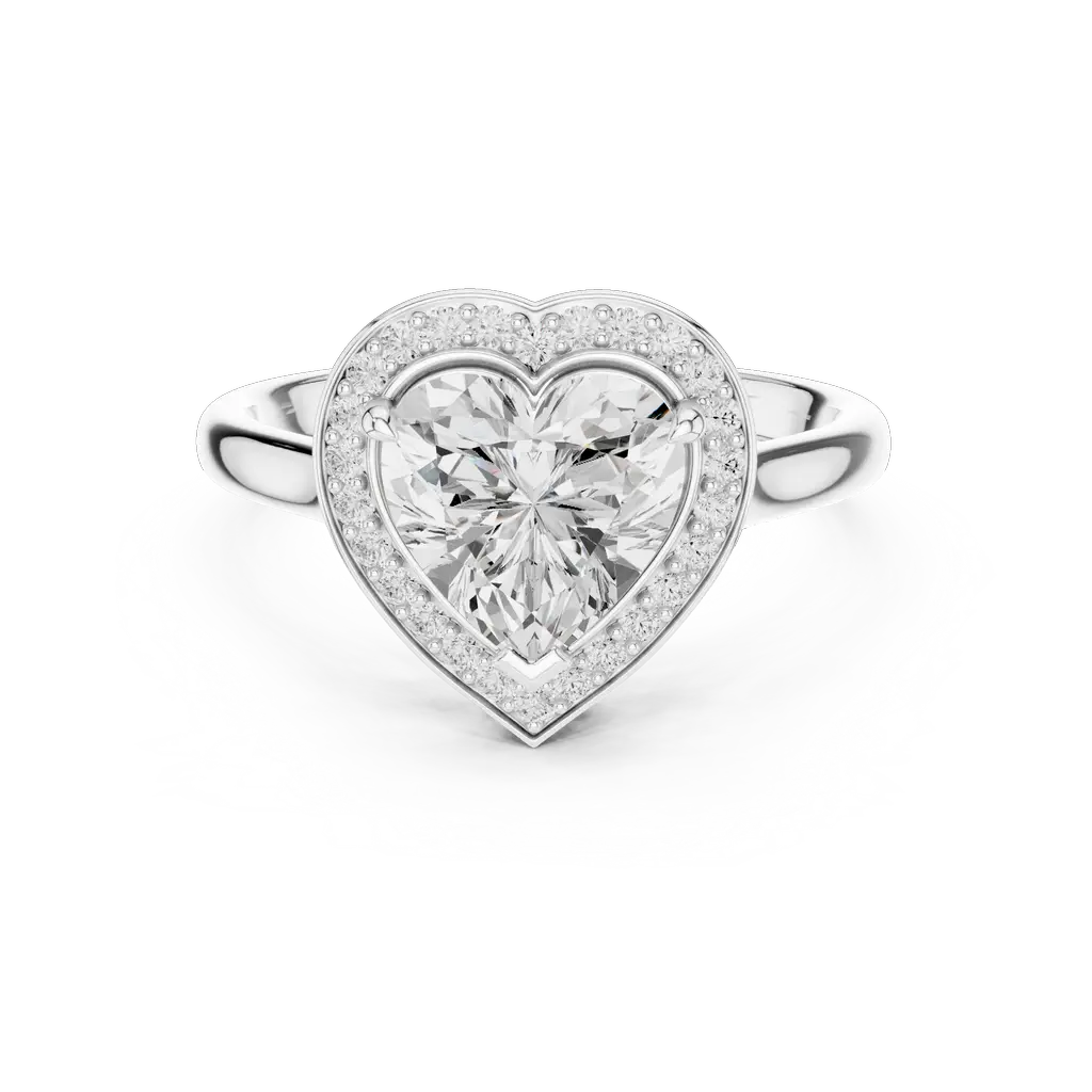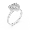 Heart-shaped diamond ring with surrounding round diamonds. Beautifully designed for elegance and love. Available in Gold, Silver, and Rose Gold finishes.
