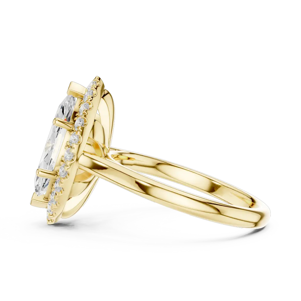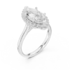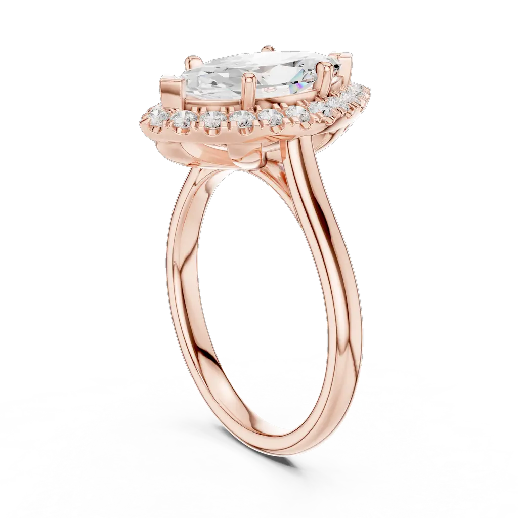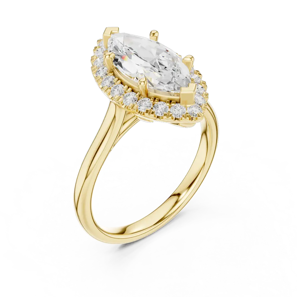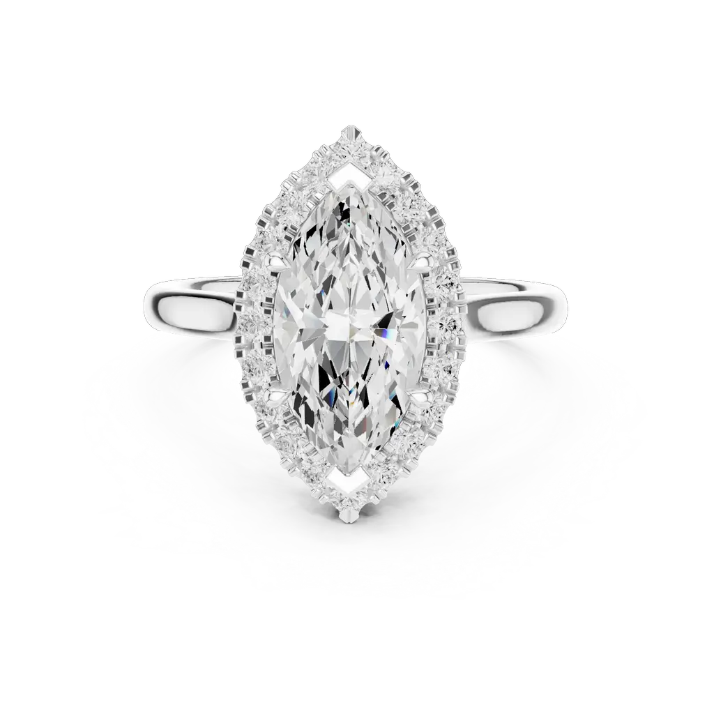 This graceful ring showcases a 13.00×6.50 mm marquise-cut diamond at its center, encased securely in a classic collet setting. Surrounding it are 20 sparkling round diamonds in a refined U-cut style. Perfectly designed for elegance and durability, this ring is ideal for everyday glam or a special occasion. Available in Gold, Silver, and Rose Gold to suit your personal style.