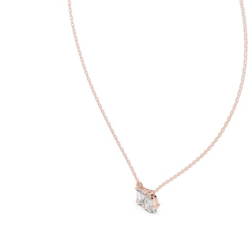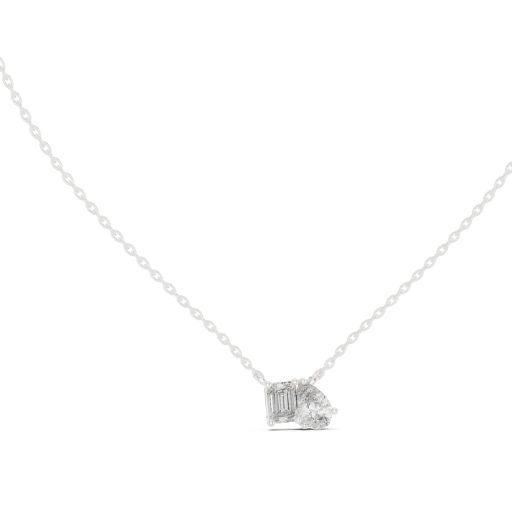This contemporary pendant design (GPD-0011) showcases a unique combination of one emerald-cut diamond (5.50×4.00 mm) and one pear-shaped diamond (7.00×4.50 mm), both securely held in a collet setting. With a total diamond weight of 0.96 carats, the piece measures 11.75 mm wide by 7.28 mm high. Available in various precious metals including platinum, gold 14K, and sterling silver. Chain not included.