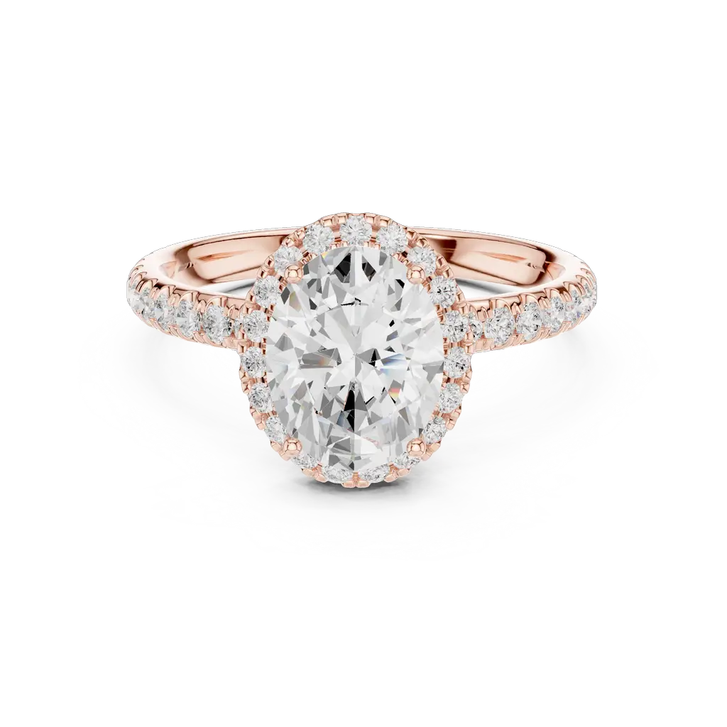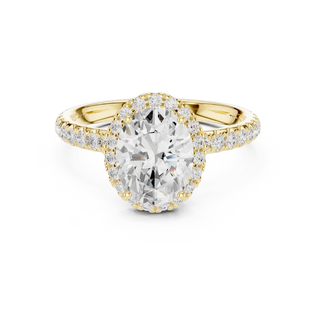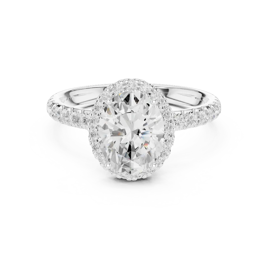 Elegant oval halo ring with 54 diamonds in U-cut, pave, and collet settings. Available in Gold, Silver, and Rose Gold for a radiant statement.
