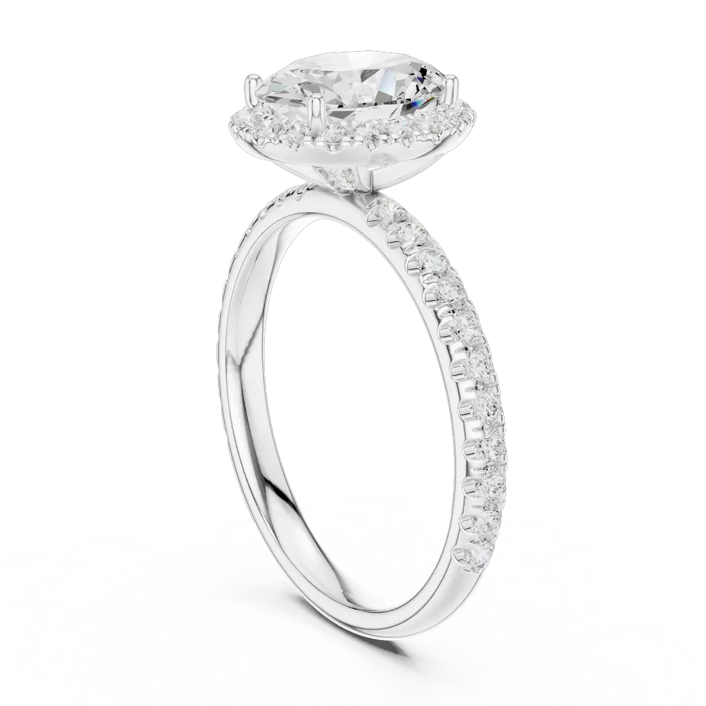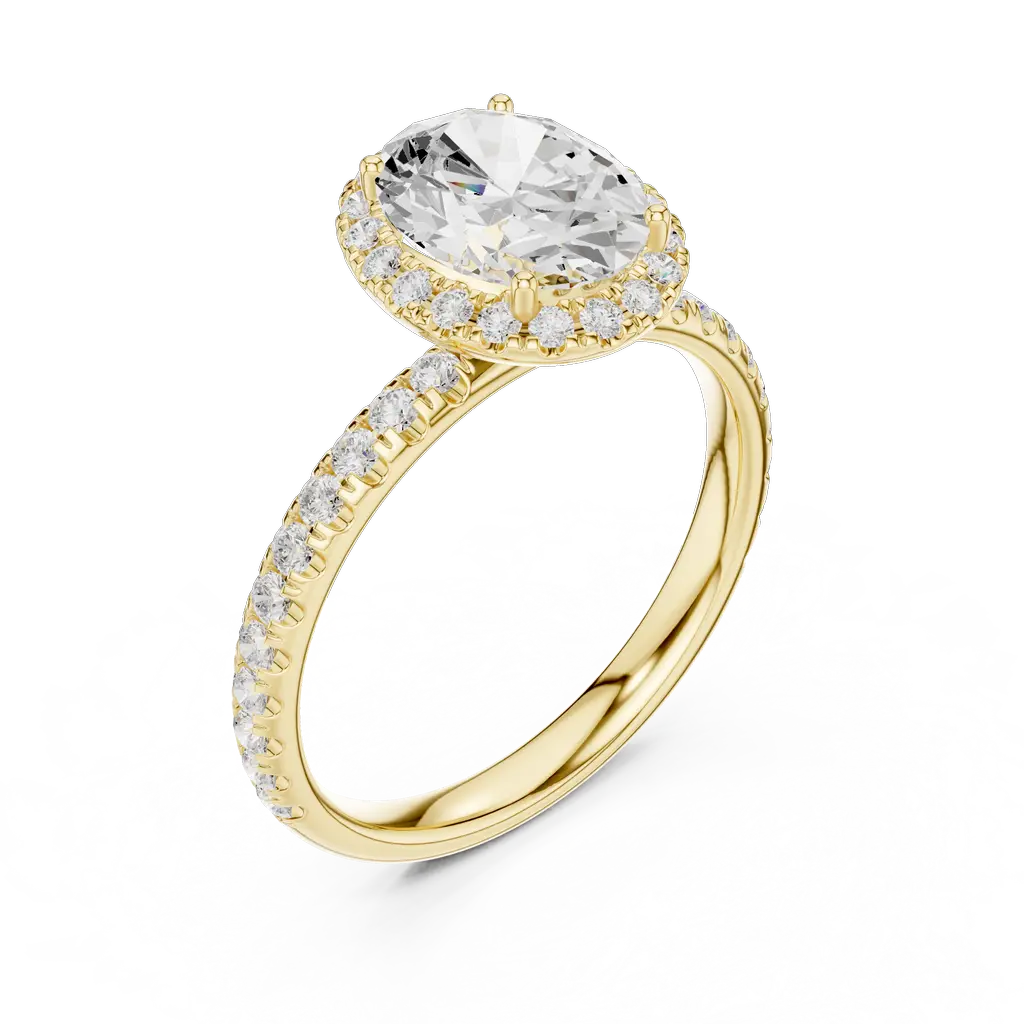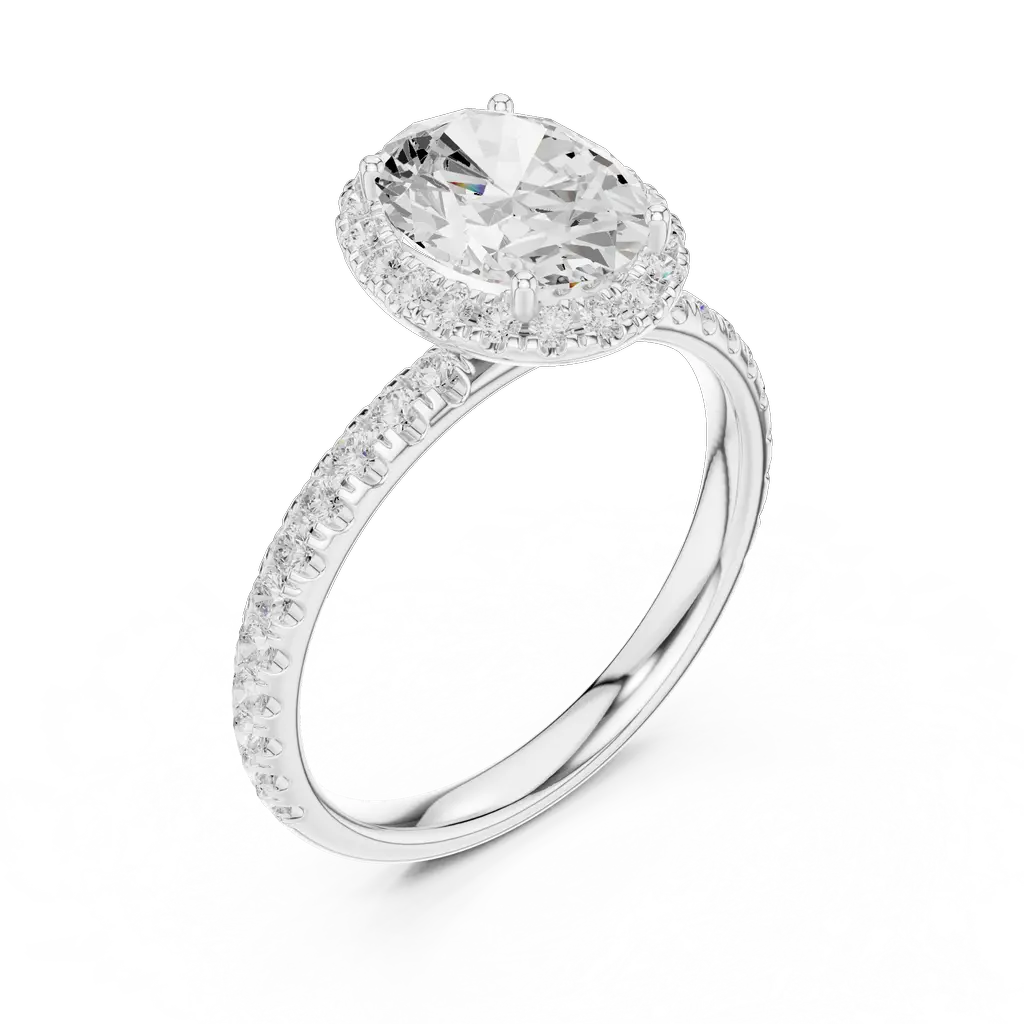 Elegant oval halo ring with 54 diamonds in U-cut, pave, and collet settings. Available in Gold, Silver, and Rose Gold for a radiant statement.