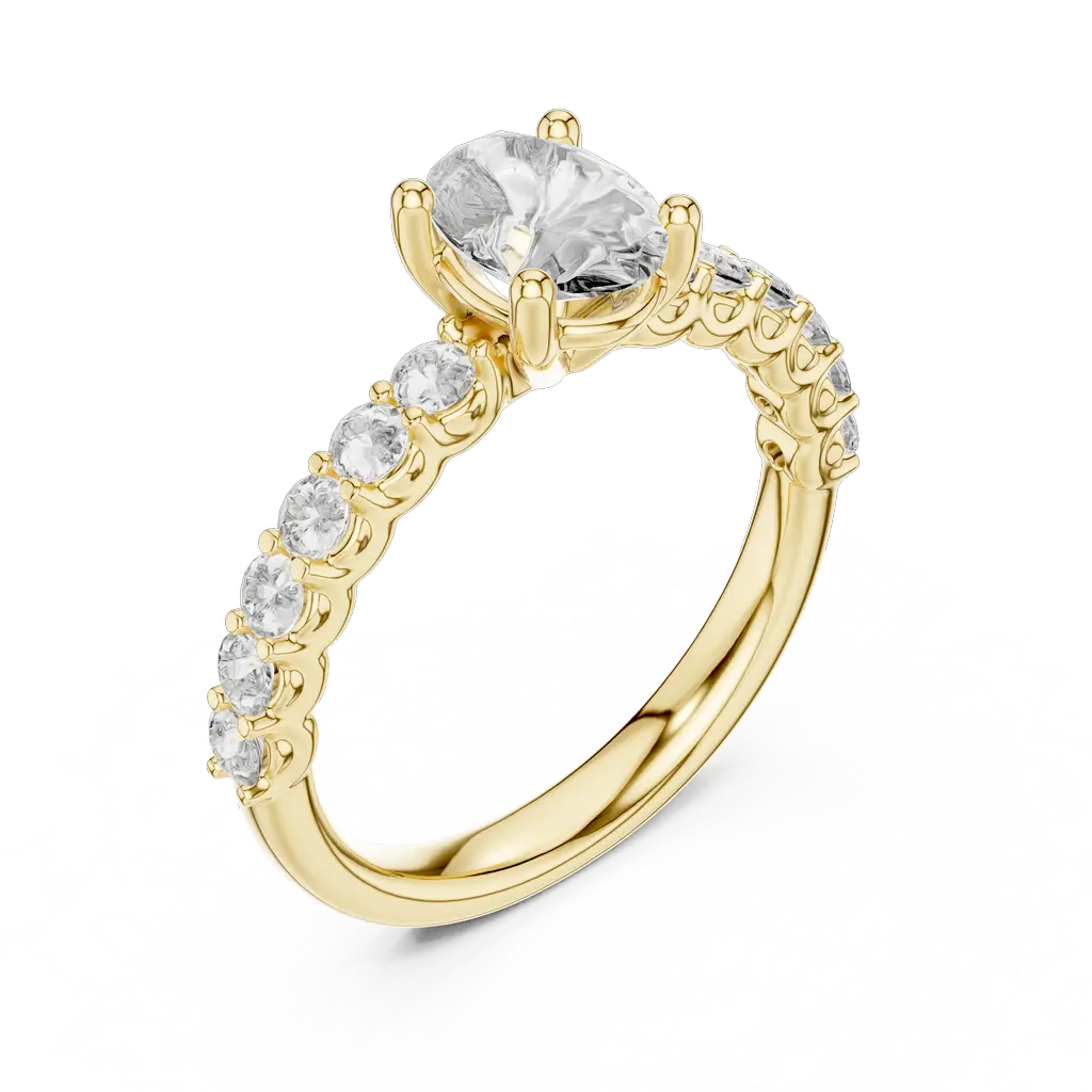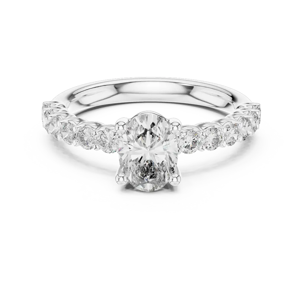 Graceful oval diamond ring with round side stones, totaling 1.553 carats. Available in Gold, Silver, and Rose Gold to match your style perfectly.
