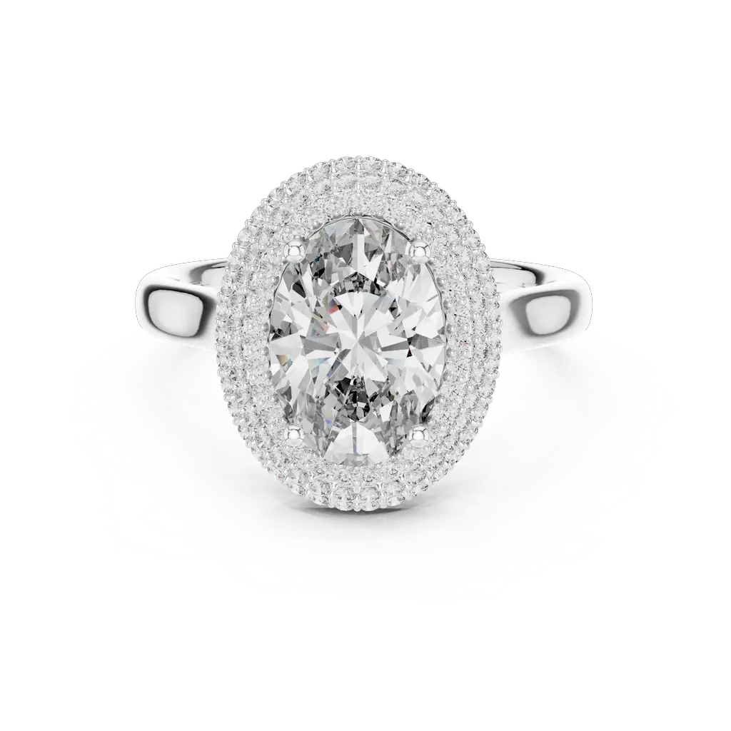 This elegant ladies ring features a stunning 10.22×7.16 mm oval center diamond, gracefully surrounded by a halo of brilliant round diamonds. With over 120 stones in total, the pave-set diamonds extend down the band for added brilliance. Perfect for a timeless statement or special occasion. Available in Gold, Silver, and Rose Gold to match your unique style.