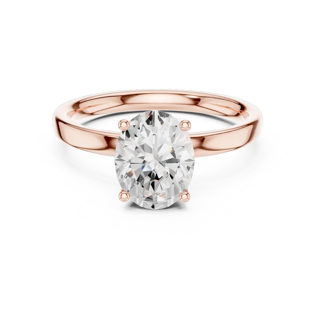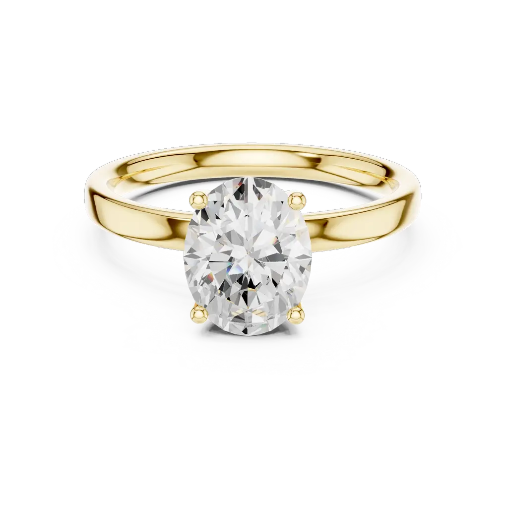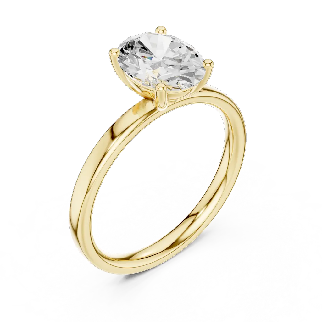 Oval solitaire ring with a 9×7 mm diamond set in a smooth court setting. Available in Gold, Silver, and Rose Gold for timeless elegance.
