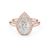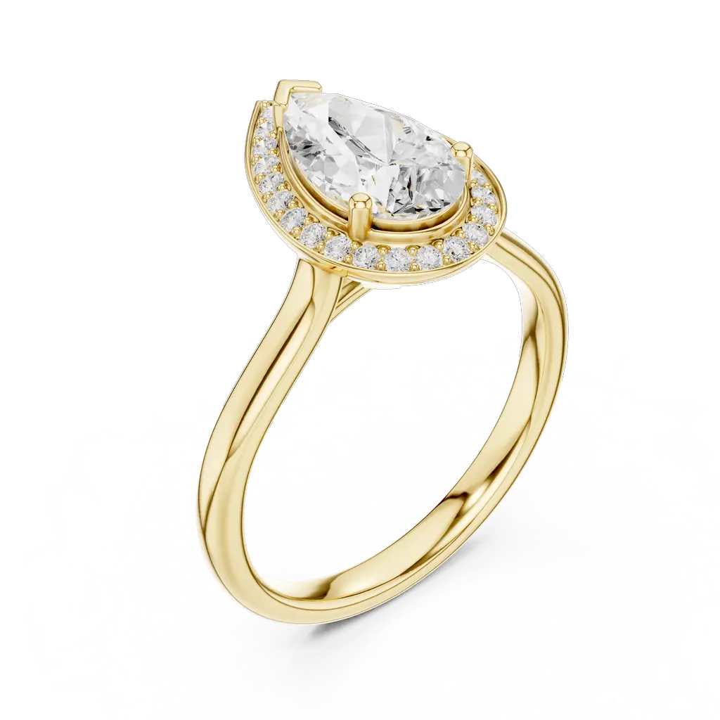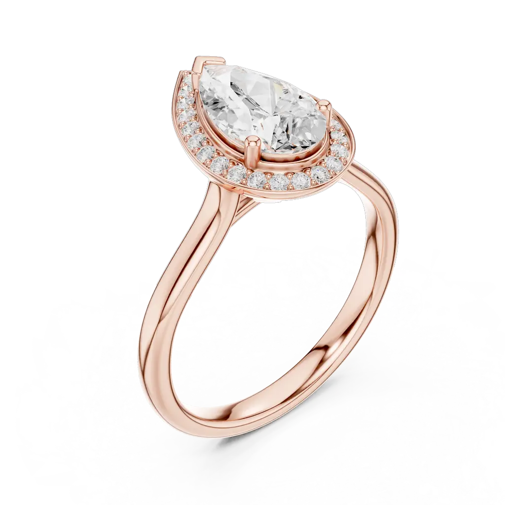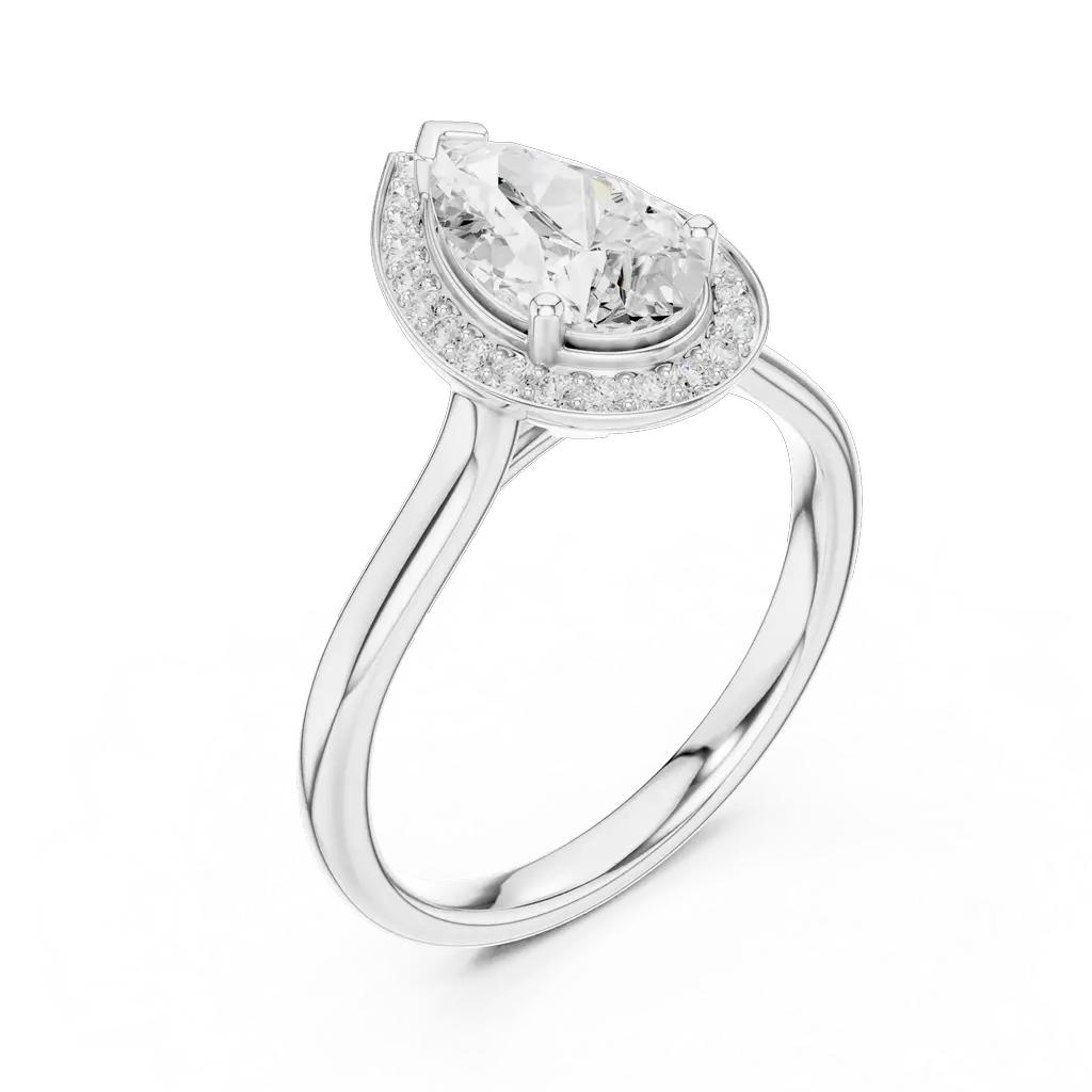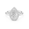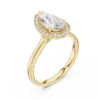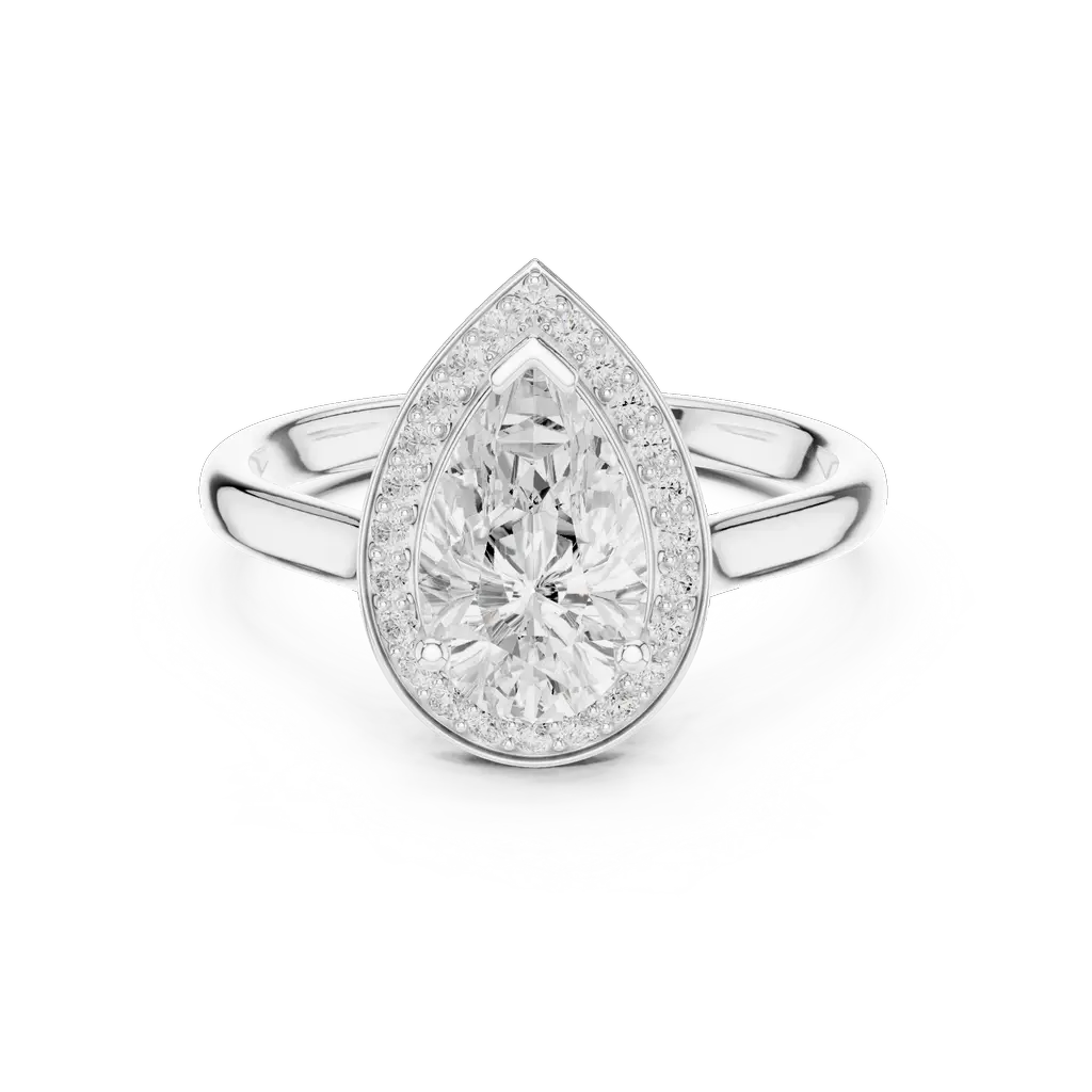 Pear-shaped diamond ring with a round diamond halo. Available in Gold, Silver, and Rose Gold. A graceful design for elegant everyday or special wear.