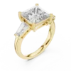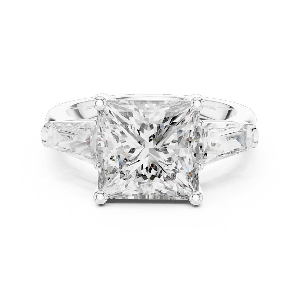 A bold and modern princess-cut diamond ring with baguette accents. Available in Gold, Silver, and Rose Gold. Elegant style for any occasion.