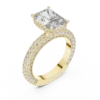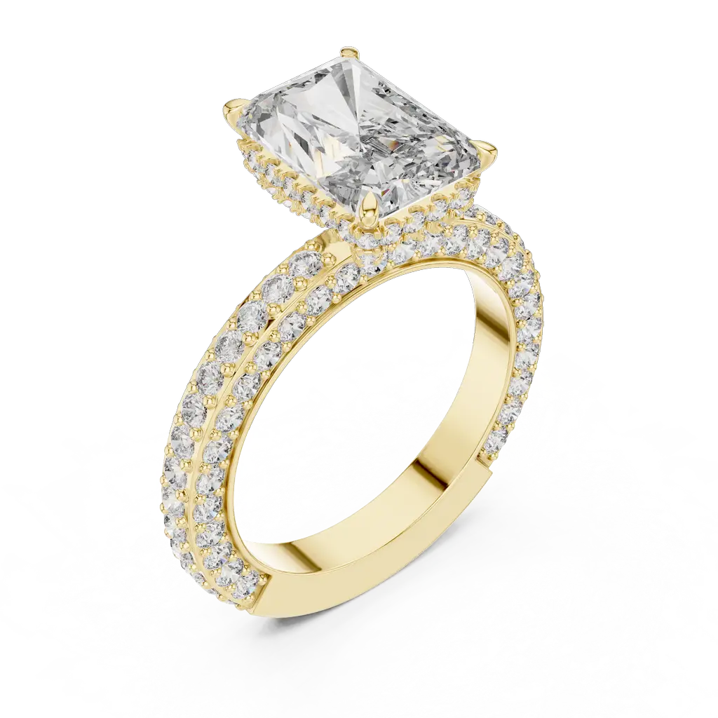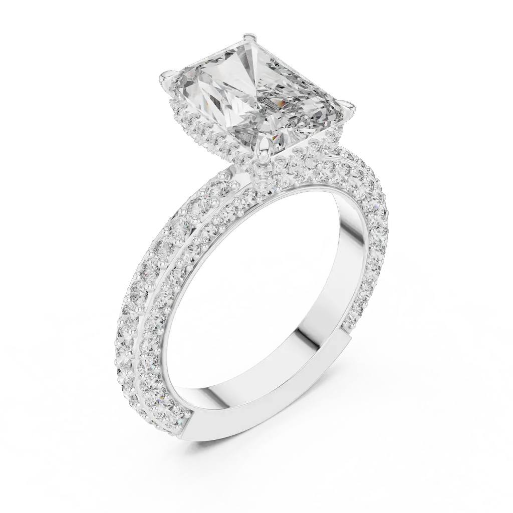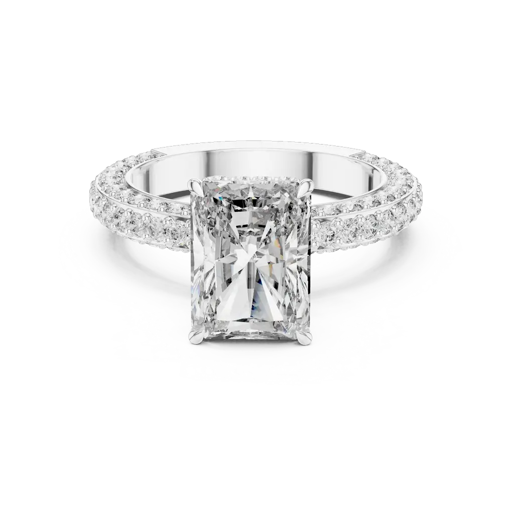 An eye-catching radiant-cut diamond takes center stage in this luxurious ring, framed with a halo and supported by 126 round diamonds that flow along the band. The detailed design enhances brilliance from every angle. Ideal for special occasions or to elevate your daily look. This masterpiece is available in Gold, Silver, and Rose Gold, offering a touch of elegance no matter your color preference.