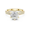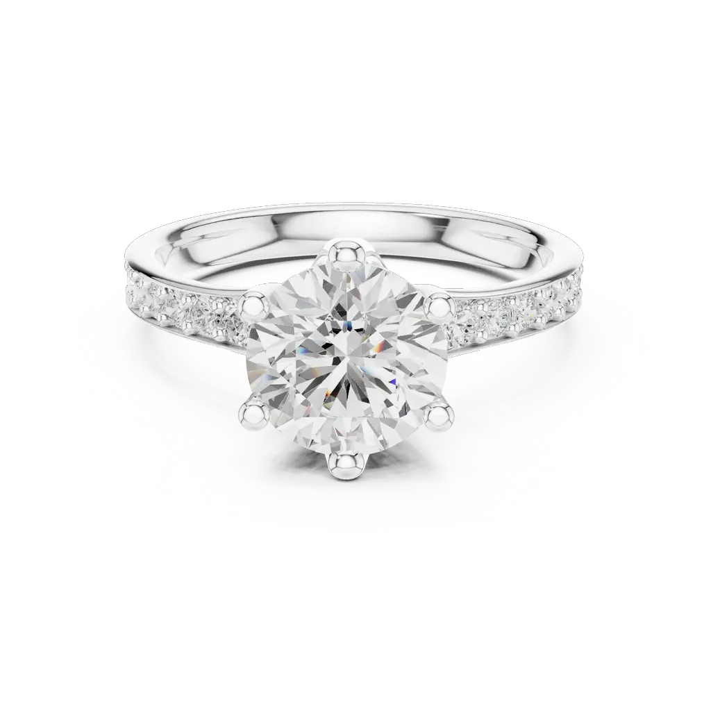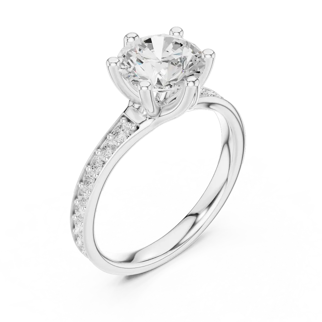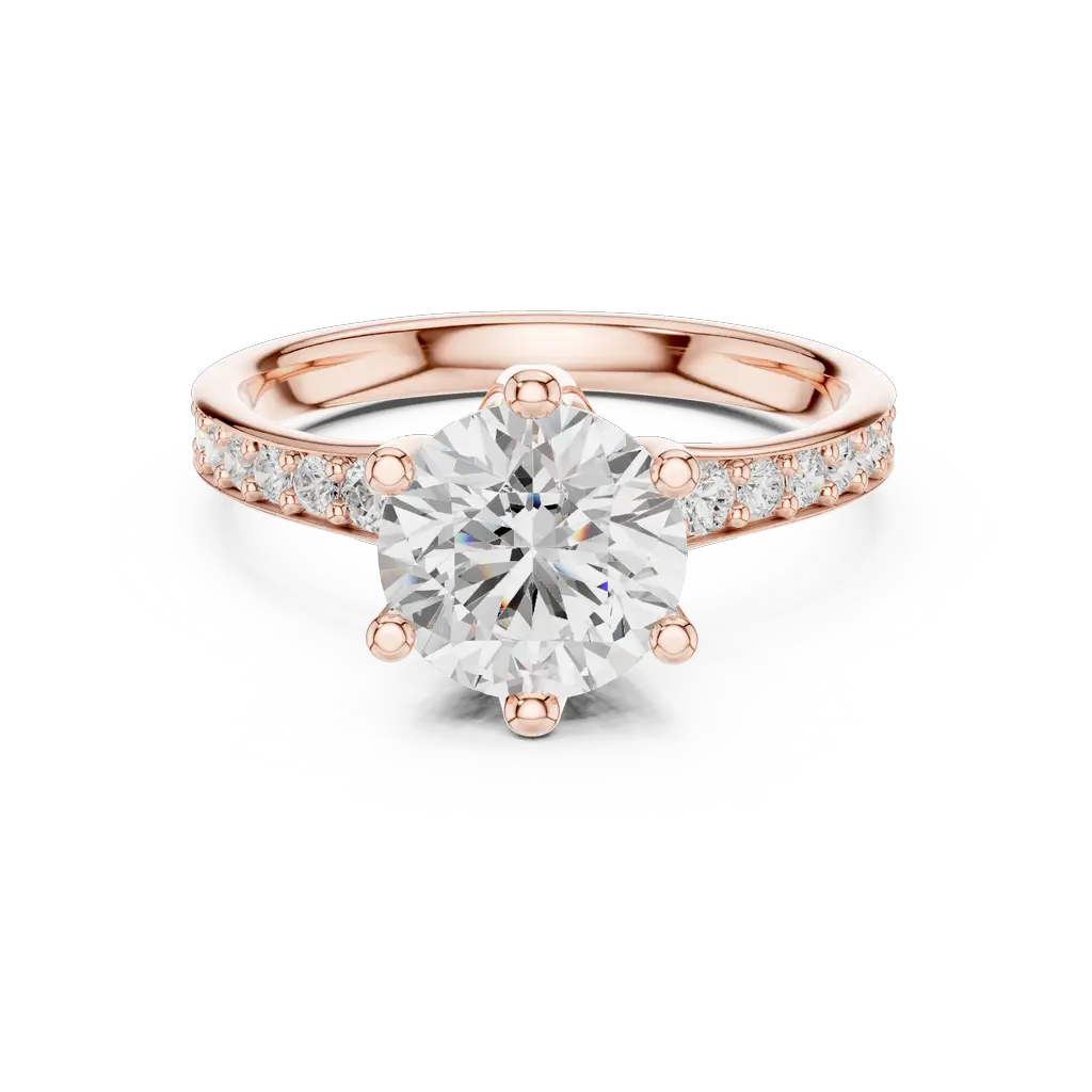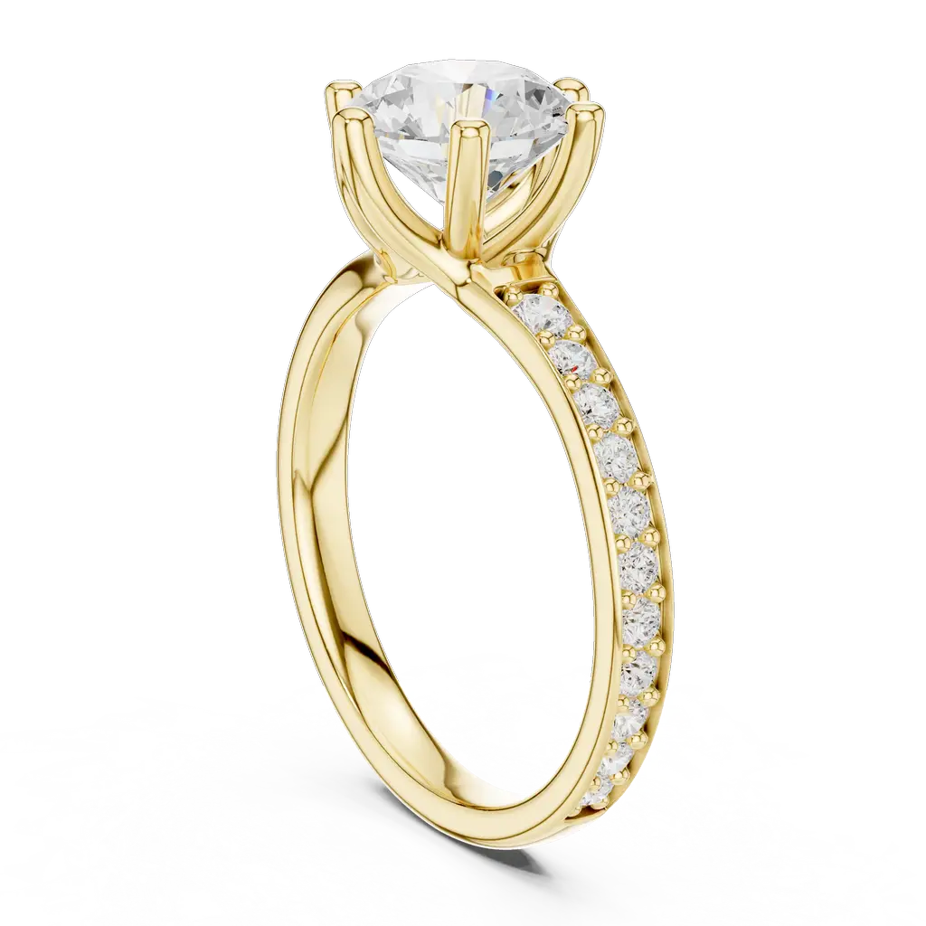 Elegant round solitaire ring with diamond-accented band in pave setting. Classic yet bold, available in Gold, Silver, and Rose Gold for every style.